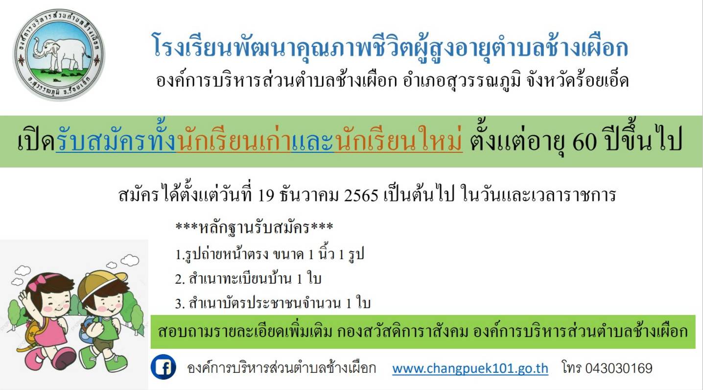 เปิดรับสมัครนักเรียนโรงเรียนพัฒนาคุณภาพชีวิตผู้สูงอายุตำบลช้างเผือก ตั้งแต่วันที่ 19 ธันวาคม 2565 เป็นต้นไป ในวันและเวลาราชการ