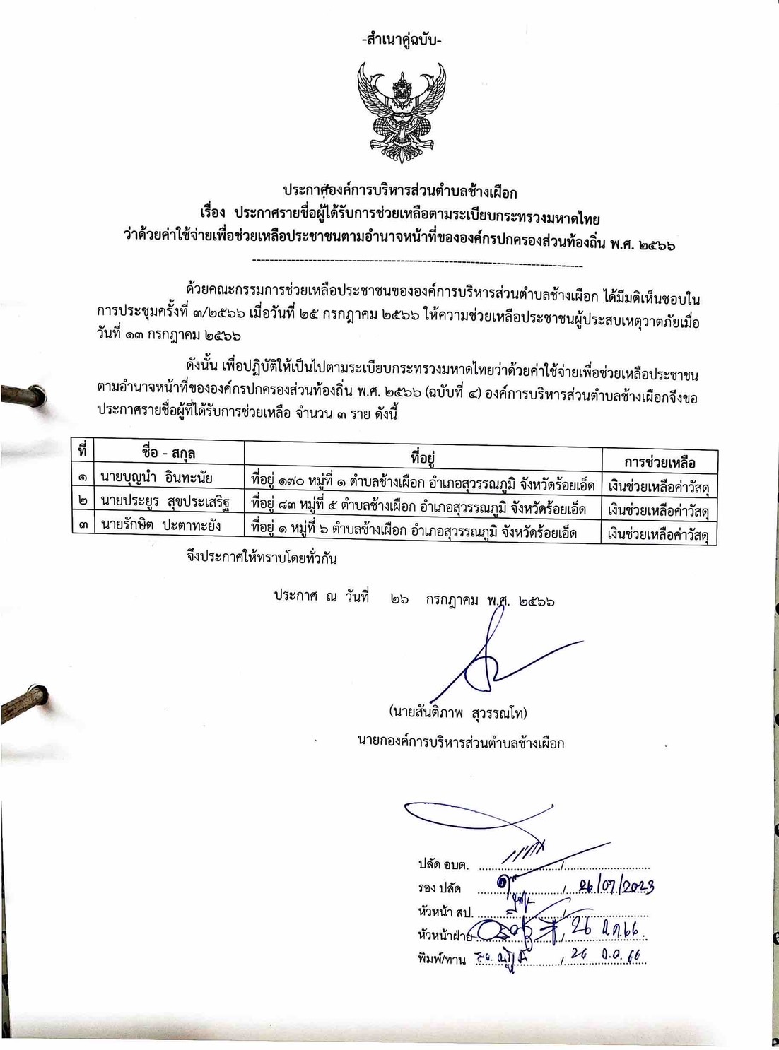 ชื่อเรื่อง : ประกาศองค์การบริหารส่วนตำบลช้างเผือก เรื่อง ประกาศรายชื่อผู้ได้รับการช่วยเหลือตามระเบียบกระทรวงมหาดไทย ว่าด้วยค่าใช้จ่ายเพื่อช่วยเหลือประชาชนตามอำนาจหน้าที่ขององค์กรปกครองส่วนท้องถิ่น พ.ศ 2566