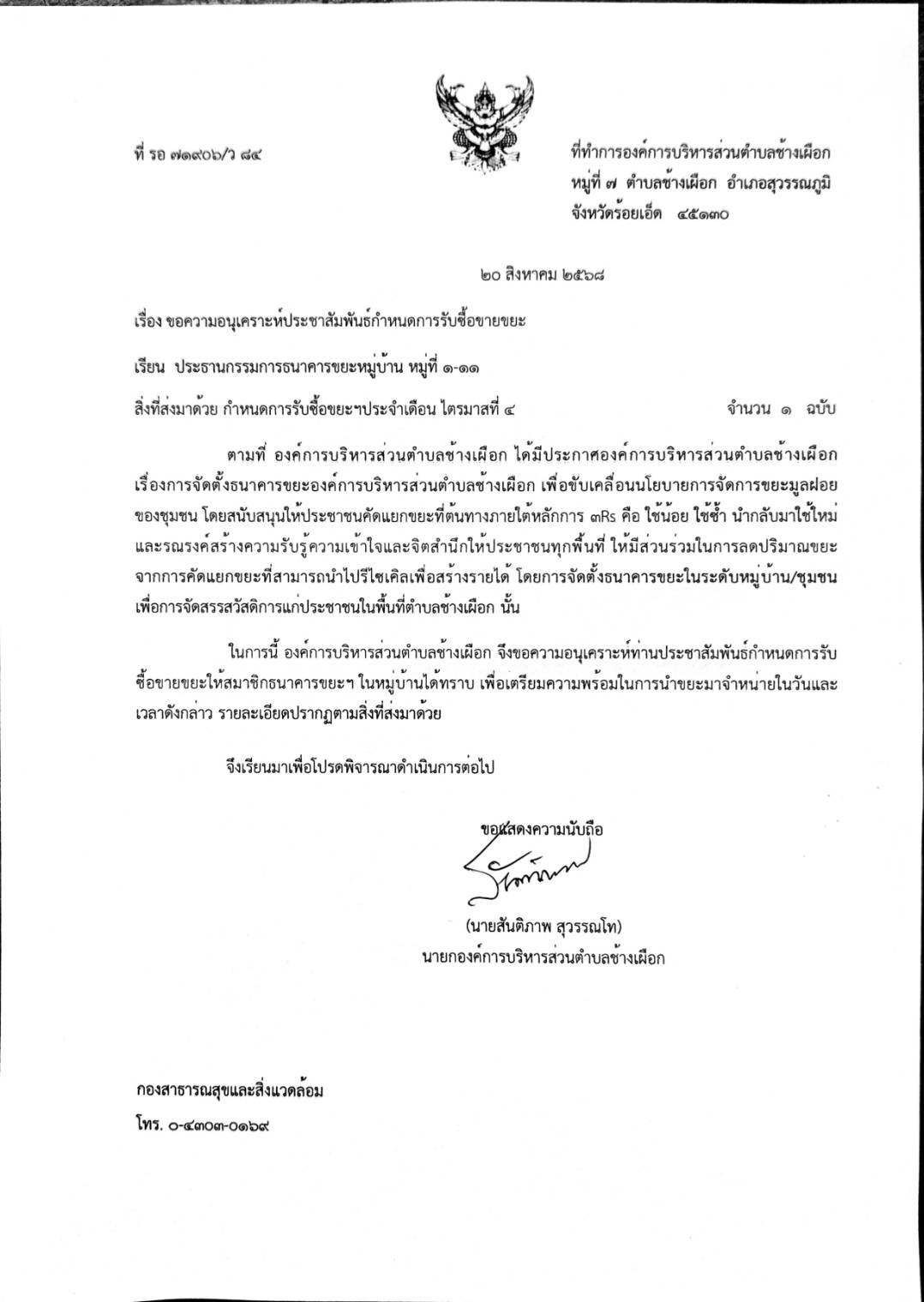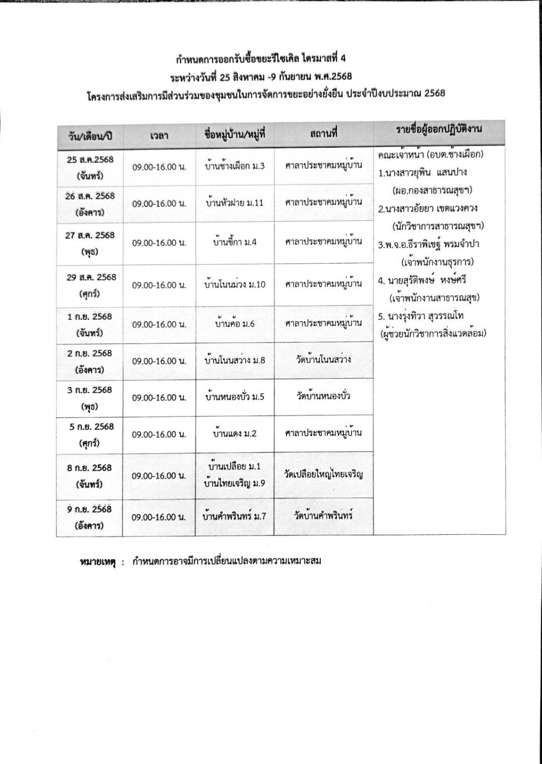 กำหนดการออกรับซื้อขยะรีไซเคิล ระหว่างวันที่ 25 สิงหาคม -9กันยายน 2568